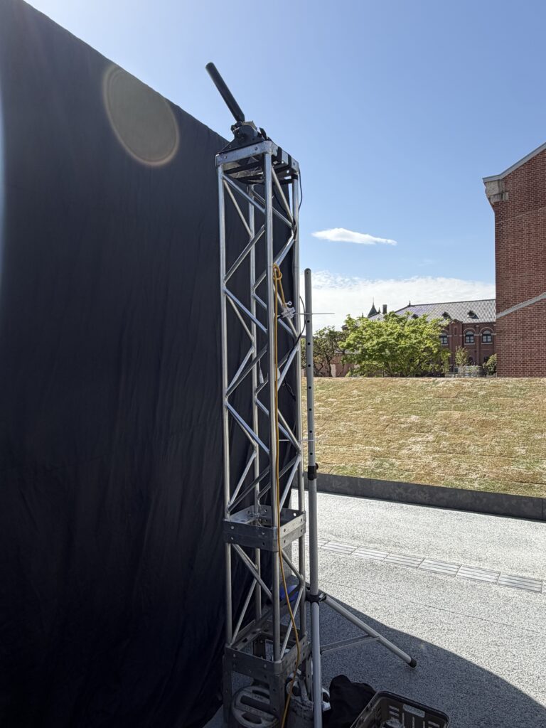 今回の演出では、高さ3mに及ぶコンクリート製のロゴ壁面に対応するため、トラスを設計・設営。